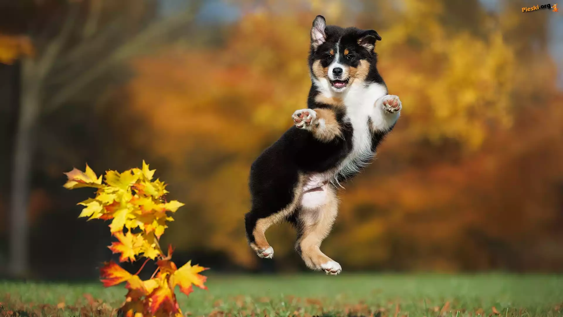 Liście =, Szczeniak, Owczarek australijski, Pies, Pożółkłe, Skok