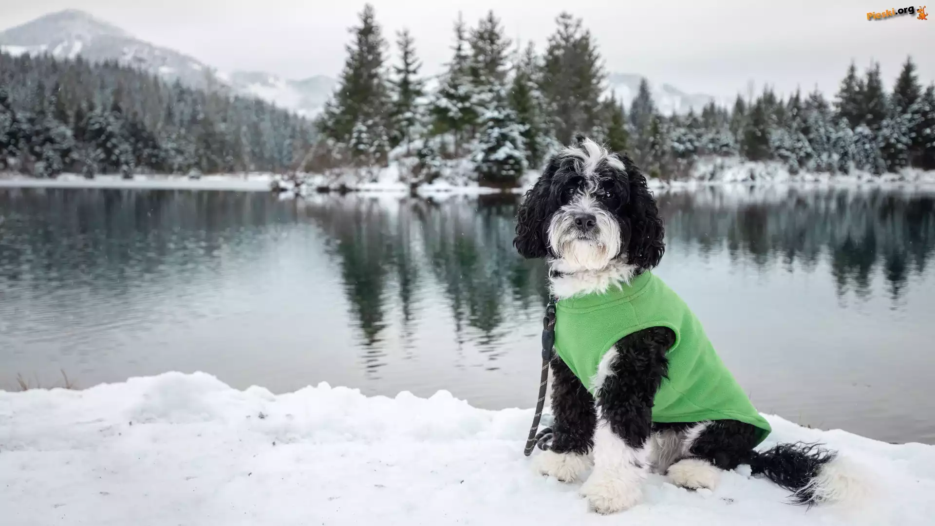 Czarno-biały, Ubranko, Zielone, Pies, Smycz, Zima, Pieski