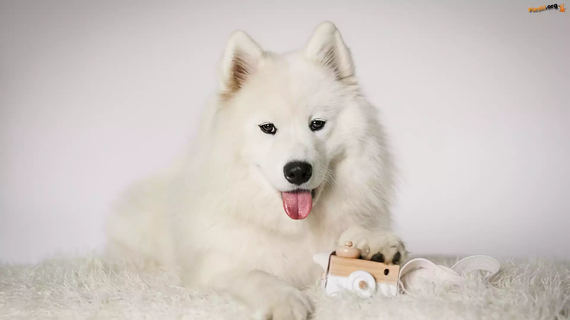 Biały, Mordka, Język, Pies, Samojed, Zabawka, Pieski