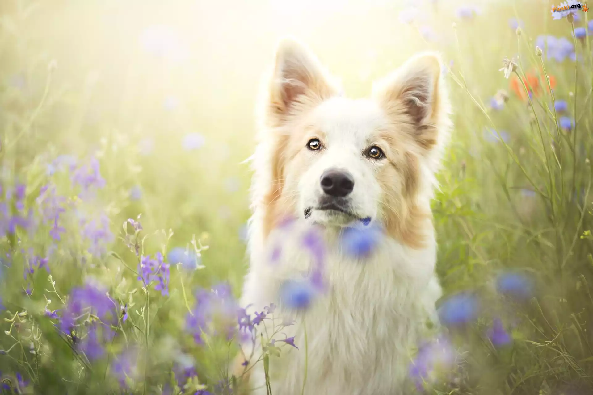 Border collie, Łąka, Kwiaty