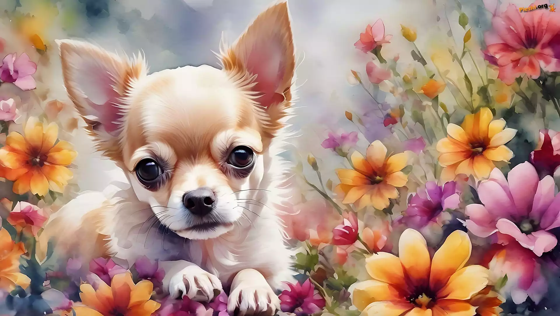 Grafika, Pies, Szczeniak, Chihuahua, Akwarela, Kwiaty, Pieski