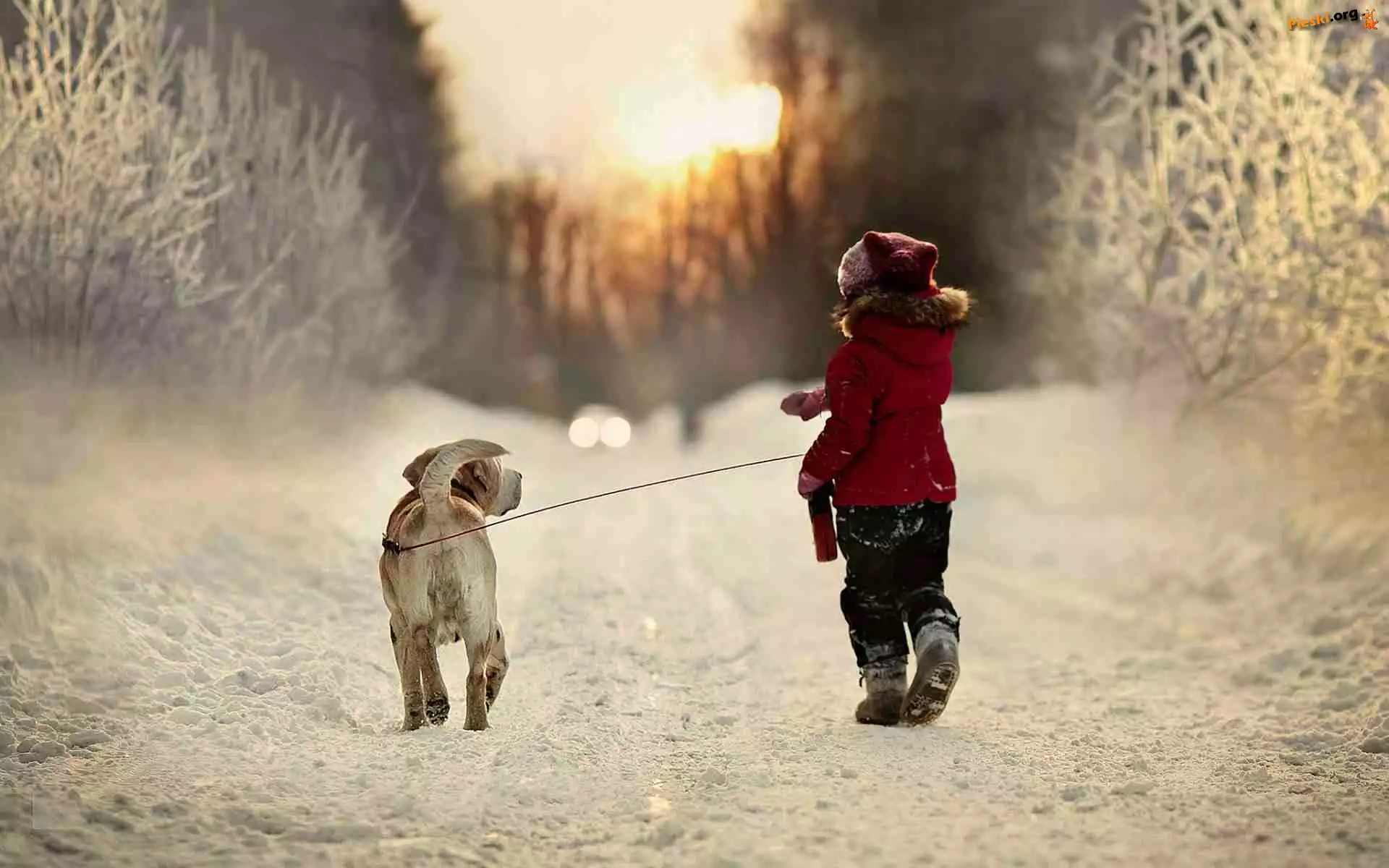 Droga, Dziewczynka, Las, Psem, Z, Spacer, Zima, Pieski