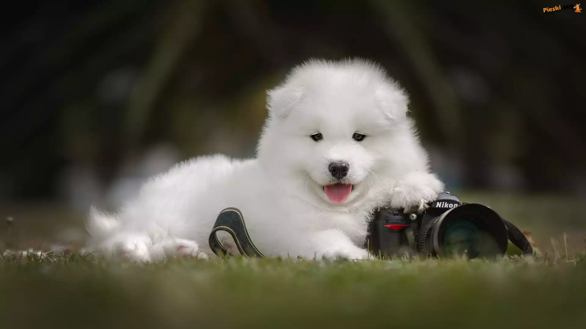 Aparat fotograficzny, Szczeniak, Pies, Samojed, Pieski