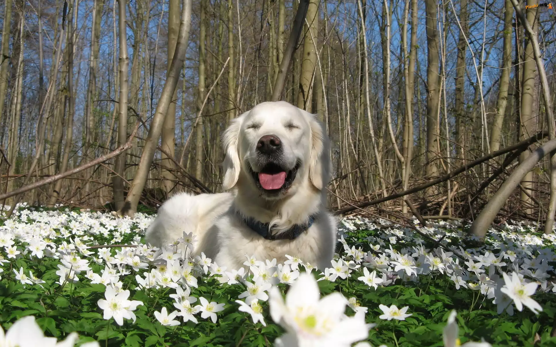 Golden Retriever, Kwiaty, Drzewa