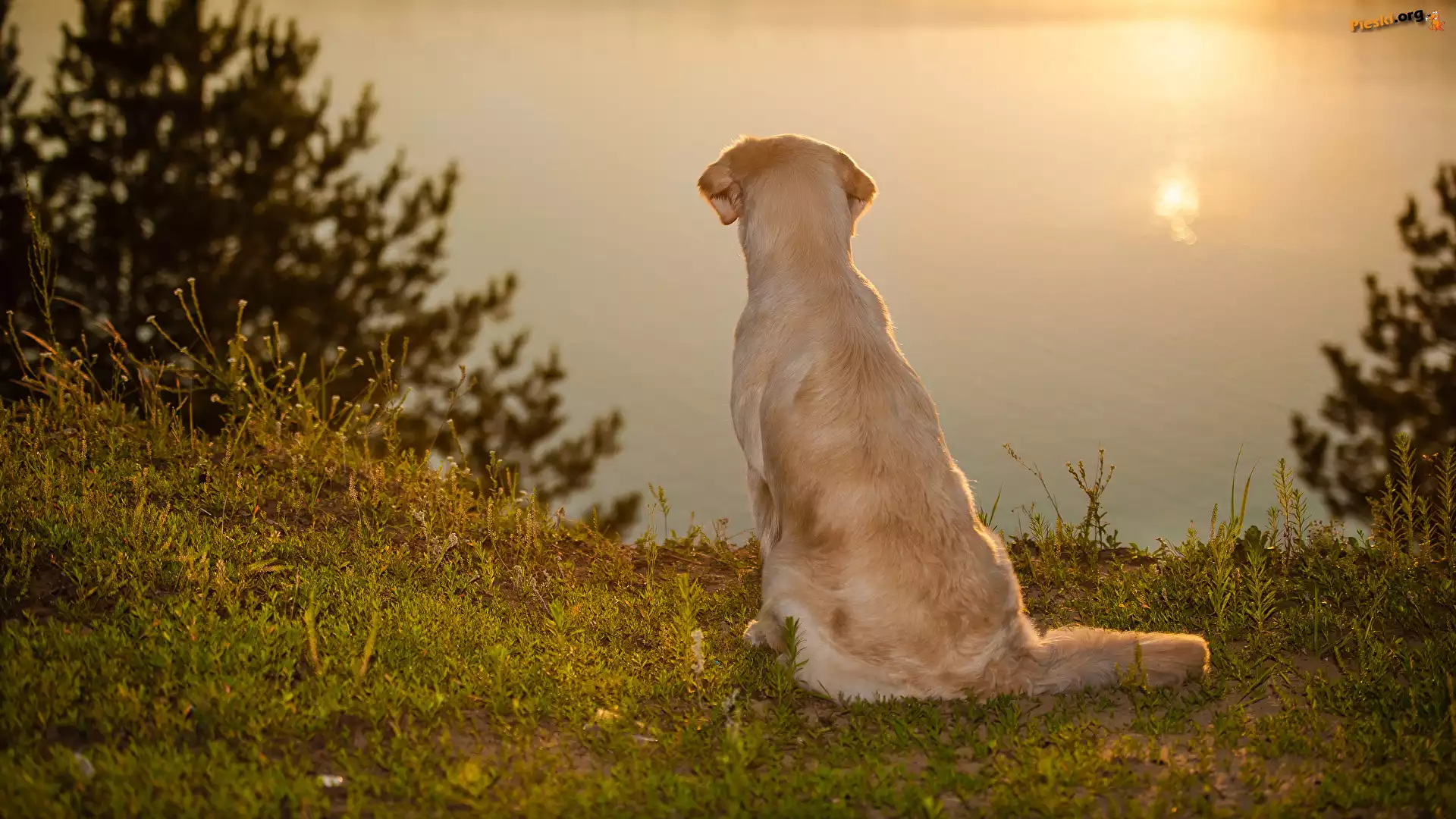 Golden retriever, Siedzący, Pies, Jezioro, Pieski