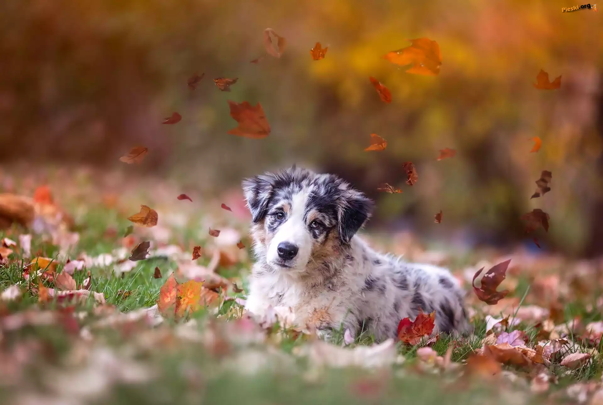 Spojrzenie, Jesień, Jesienne, Owczarek, Pies, Australijski, Liście, Pieski