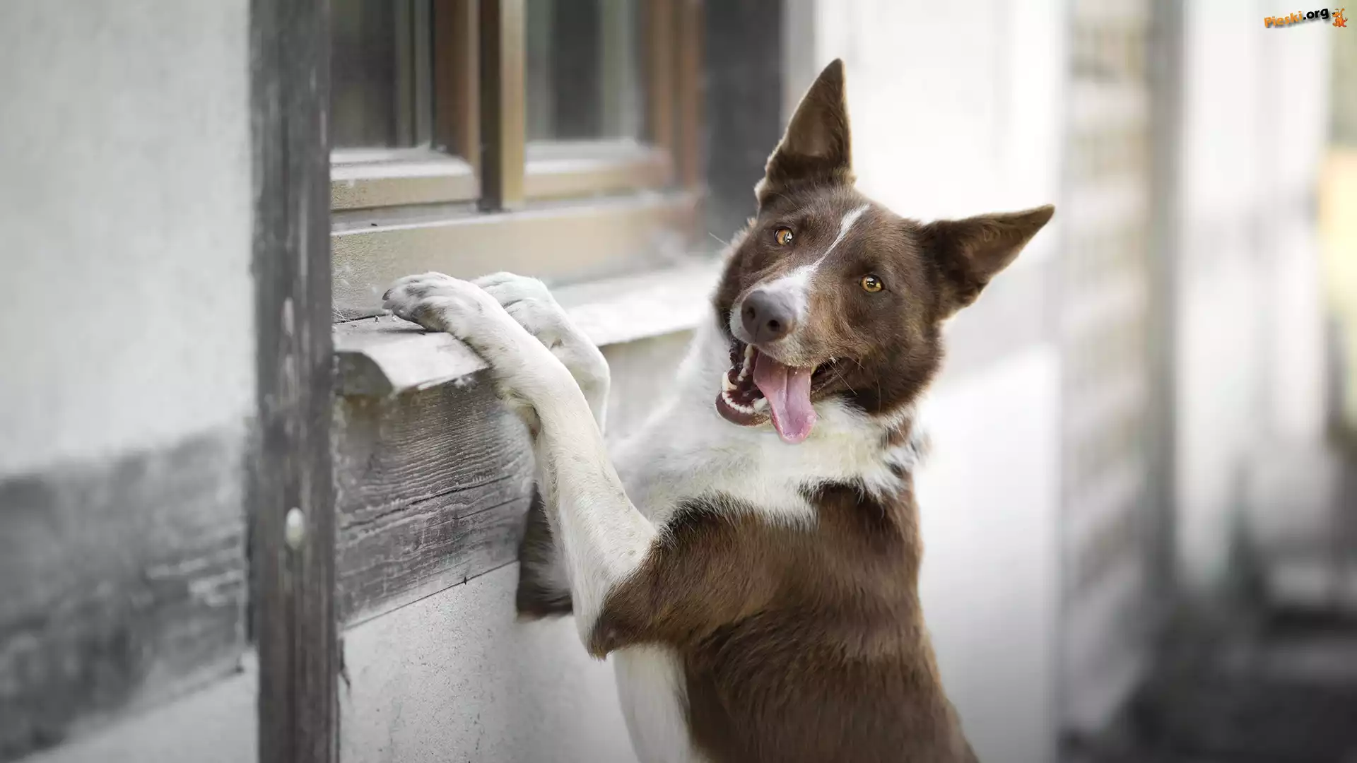 Jęzor, Brązowo-biały, Pies, Mordka, Okno, Pieski