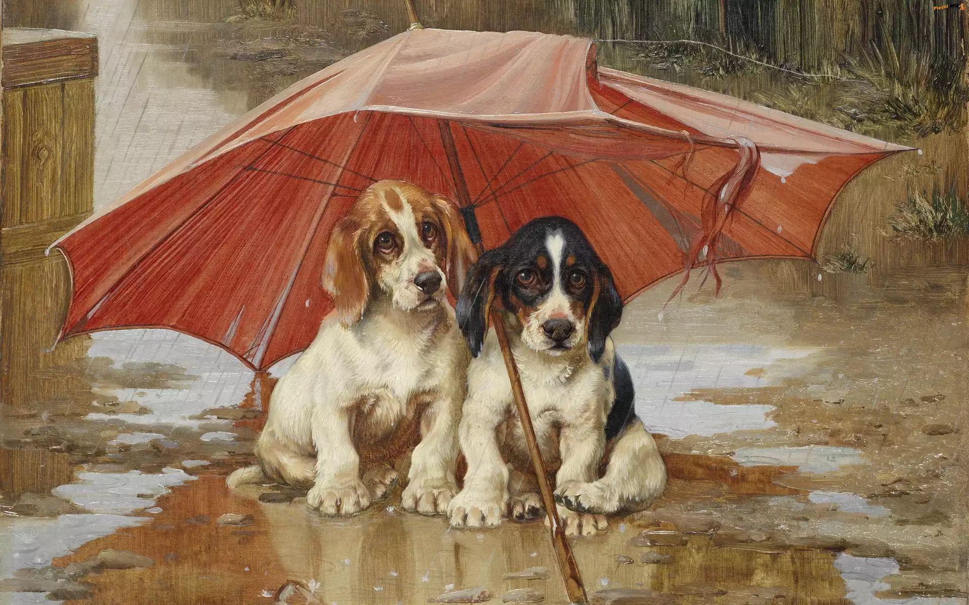 Deszcz, Malarstwo, Parasol, Wiliam Henry Hamilton Trood, Obraz, Psy, Kałuża