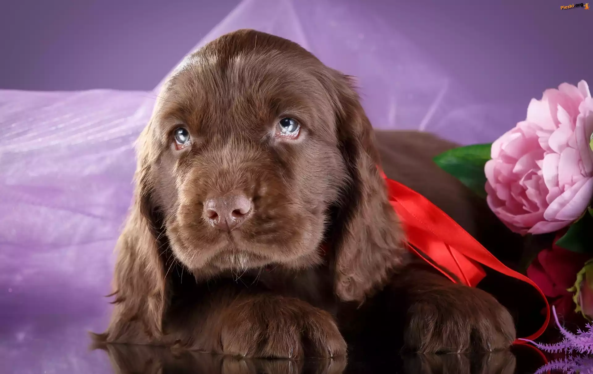 Kwiat, Szczeniak, Spaniel, Piwonia, Pieski
