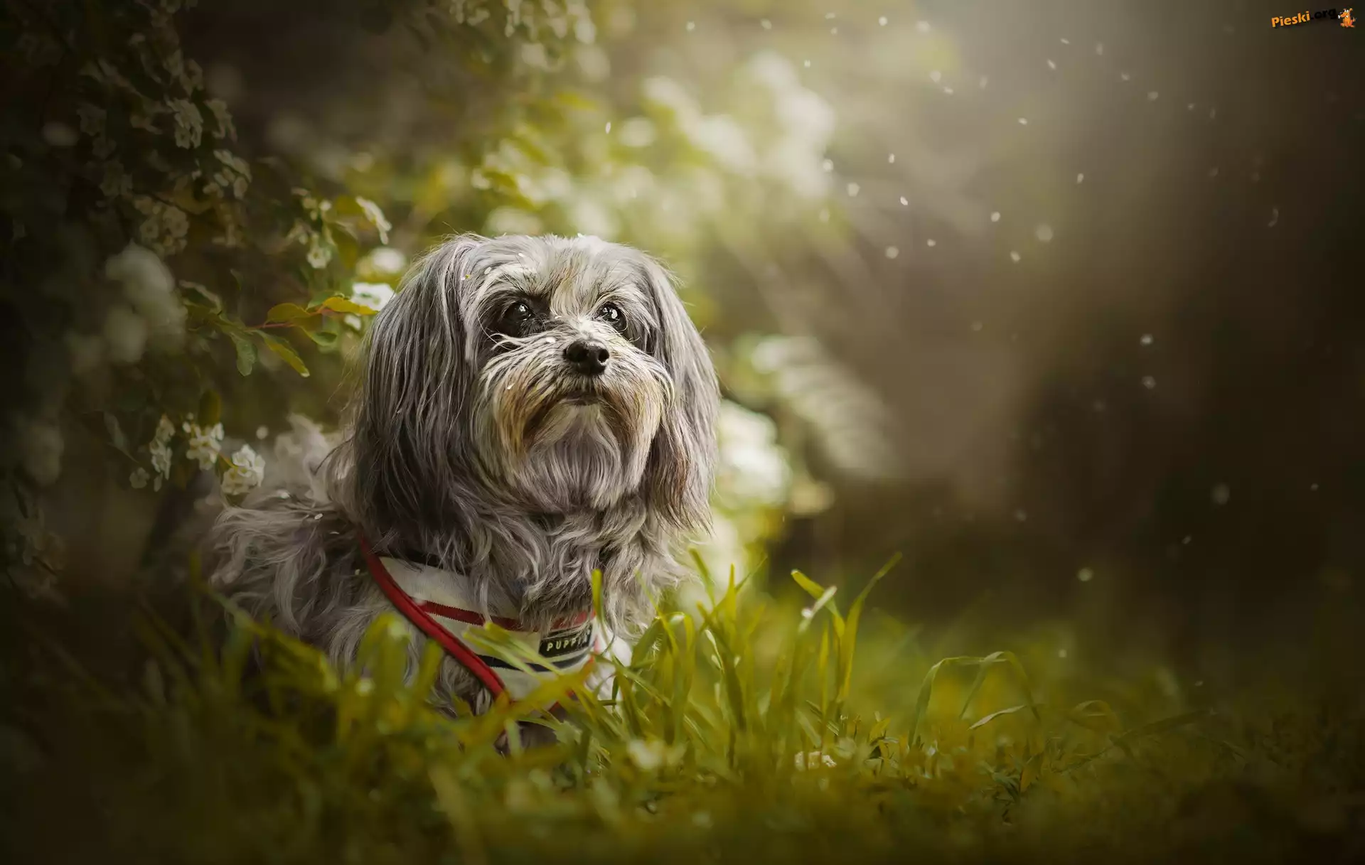 Lwi piesek, Trawa, Rośliny Pies, Trawa Róże, Szary, Piesek Trawa, Lwi Piesek, Dwa, Szczeniaki dwa, białe, Lwi pieski Głowa, Lwi piesek, Lowchen, Trawa