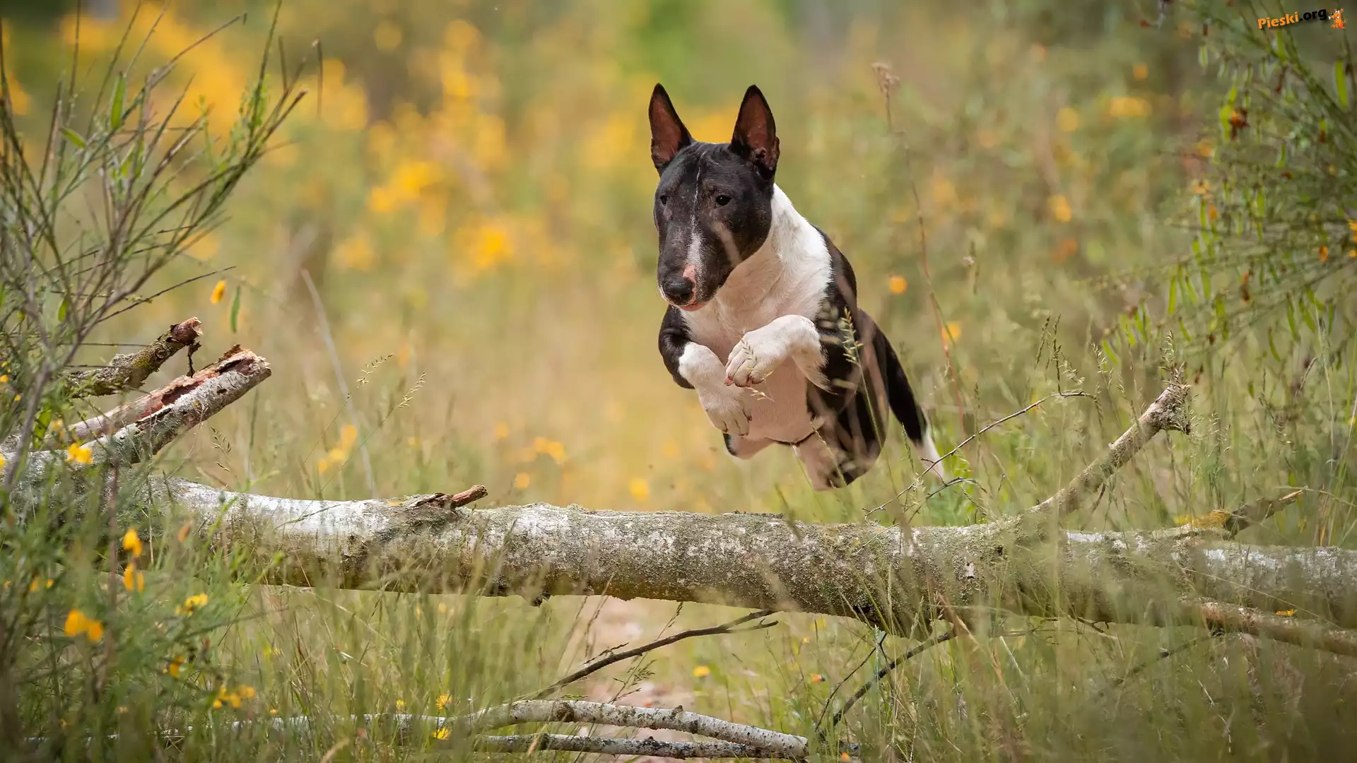 Kwiaty, Pies, Bulterier, Ścieżka Pies, Bulterier Pień, Bulterier, Pies, Skok, Kłoda Bulteriery Pies, Bulterier, Dywan Język, Bulterier, Biały, Głowa, Łata Biały, Bulterier, Trawnik Ściółka, Bulterier, Pies, Pień, Las Biały, Bulterier