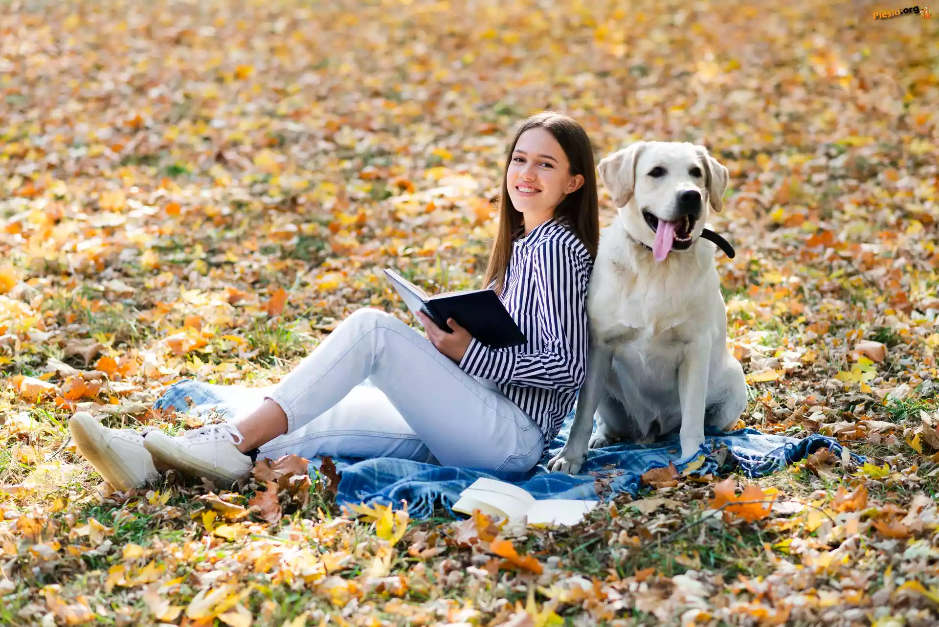 Liście, Kobieta, Książka, Labrador retriever, Długowłosa, Biały, Pies