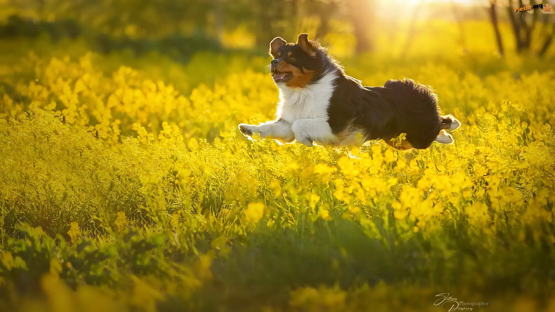 Żółte, Skaczący, Pies, Kwiaty