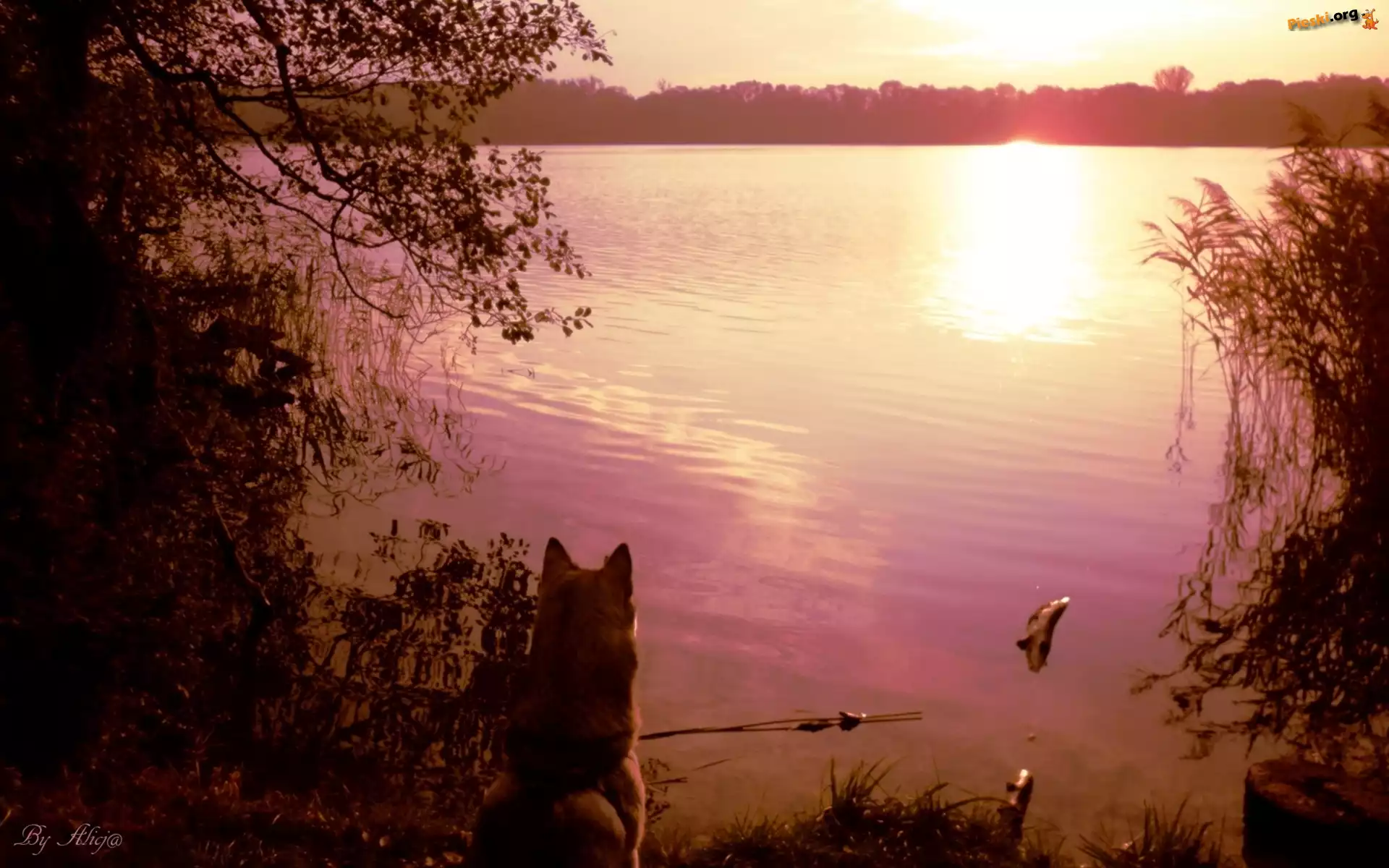 Pies, Zachód, Jezioro, Słońca, Szuwary, Pieski