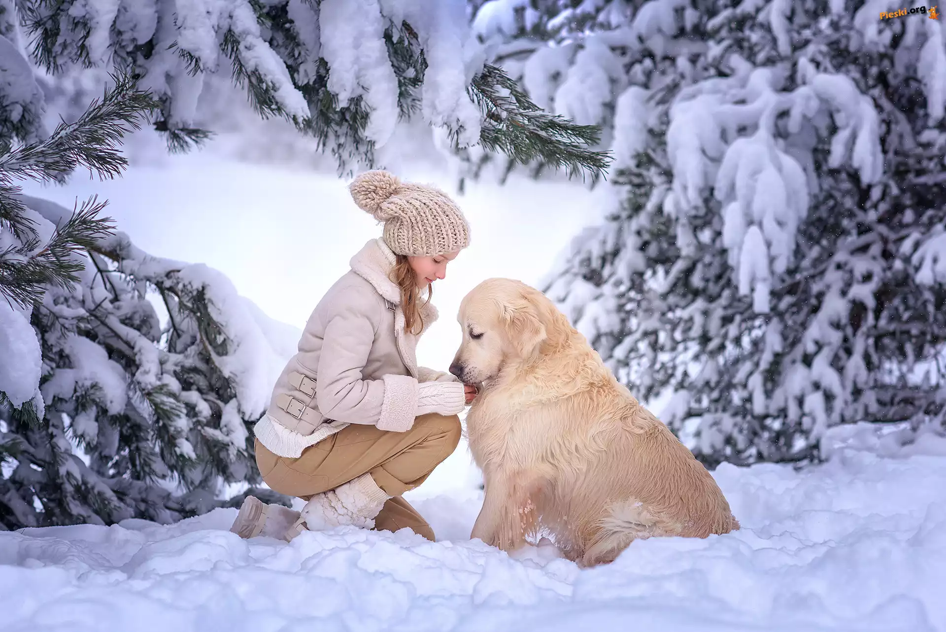 Zima, Pies, Dziewczynka, Drzewa, Śnieg, Golden retriever, Pieski
