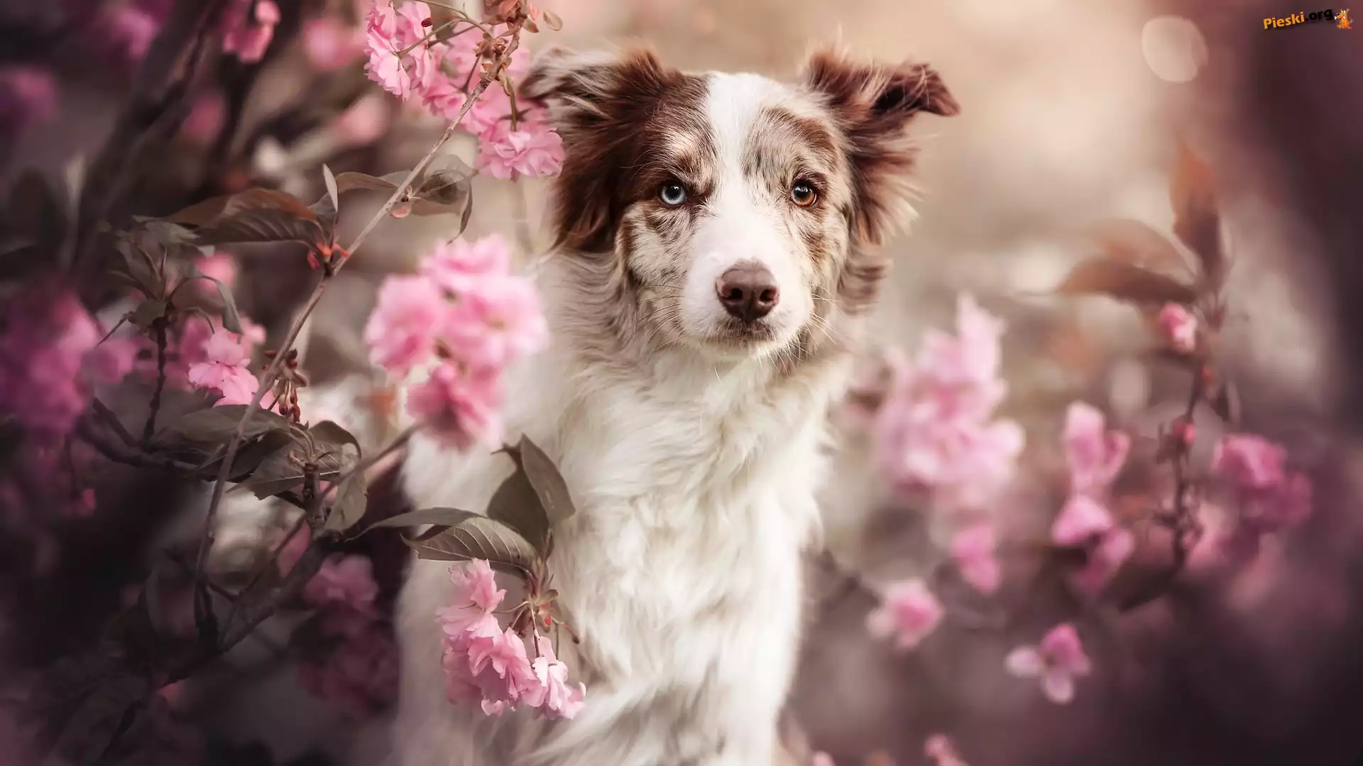 Kwiaty, Różowe, Pies, Border collie, Pieski