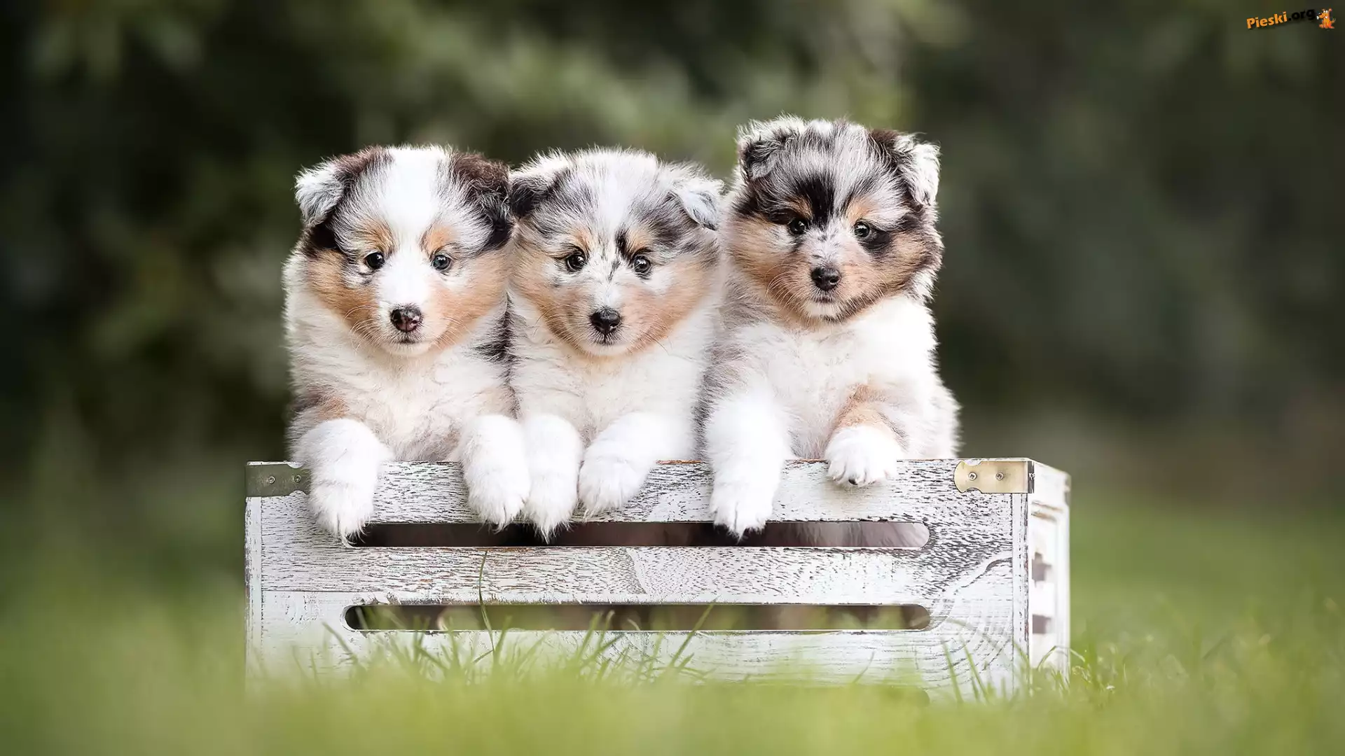 Szczeniaki, Skrzynka, Trzy, Trawa, Psy, Pieski