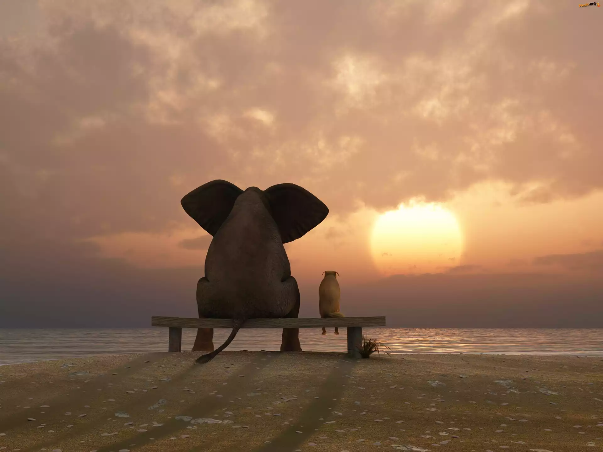 Słoń, Słońca, Zachód, Morze, Pies, Pieski