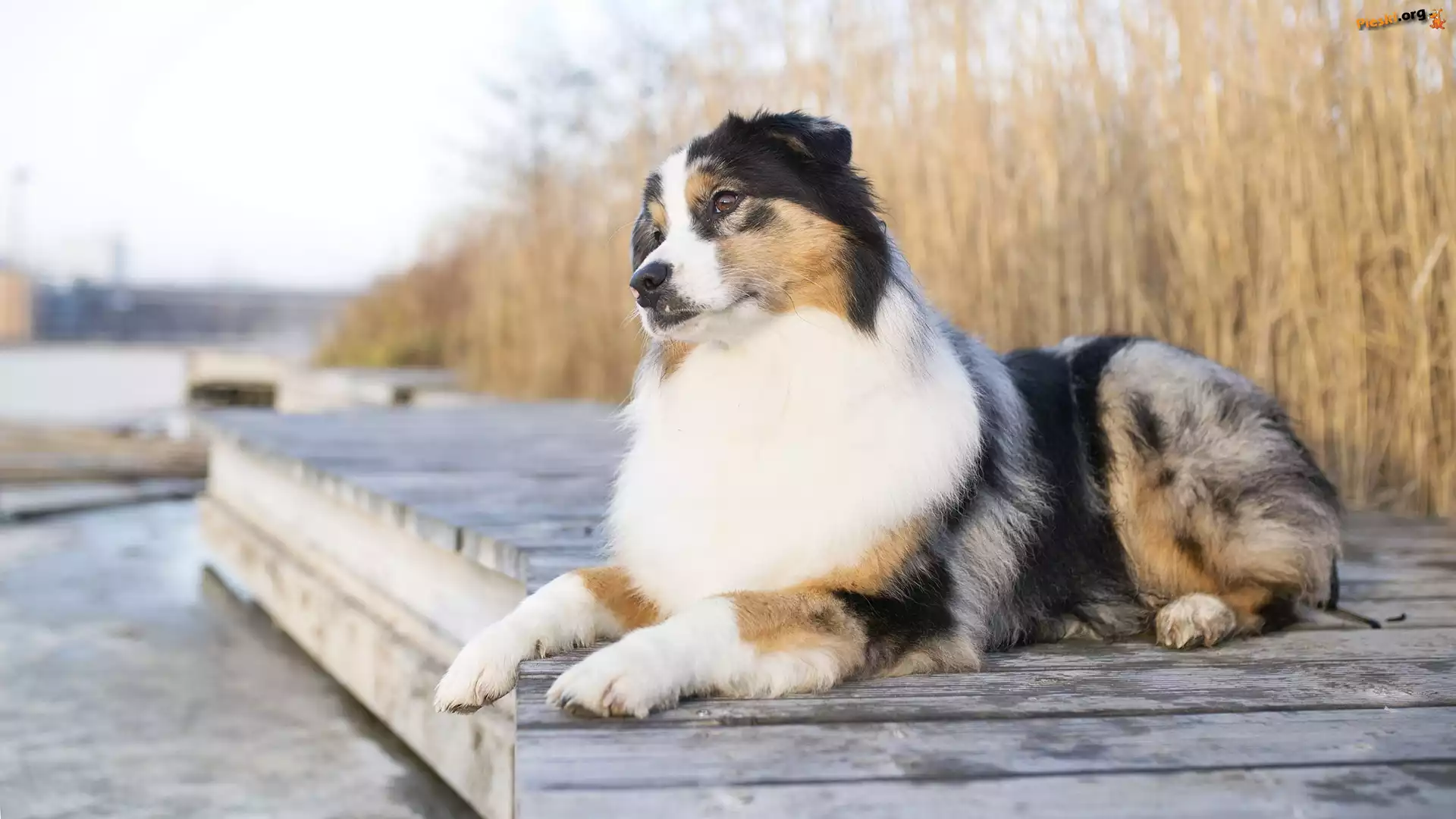 Trawy, Owczarek australijski, Pies, Pomost, Woda