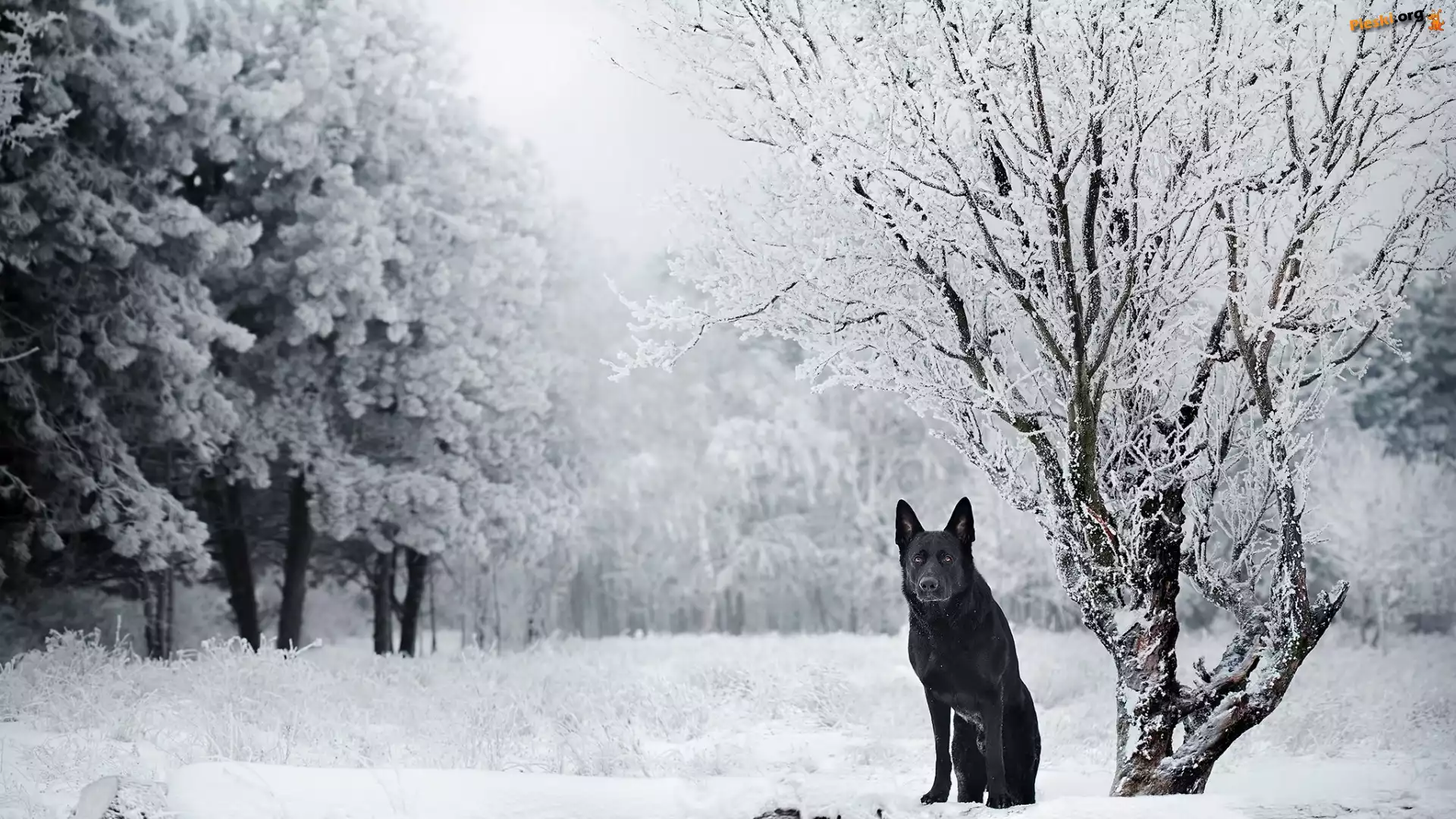 Zima, Pies, Czarny owczarek niemiecki, Drzewa